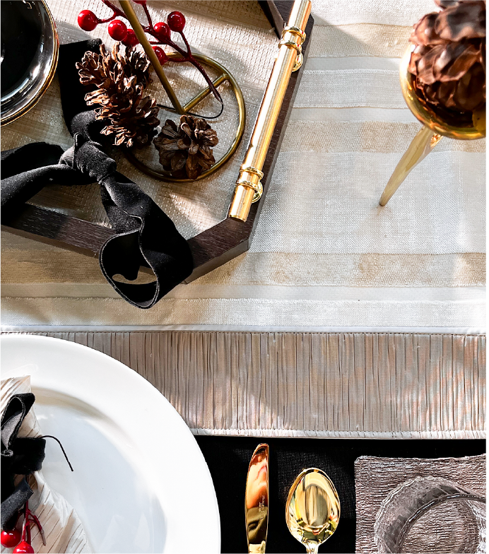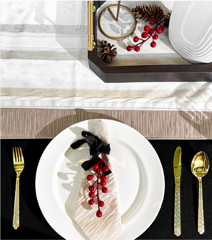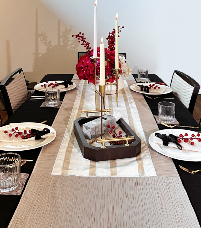 The elegantly adorned table runner creates a sense of purity and serenity, setting the stage for a beautiful year-end celebration.