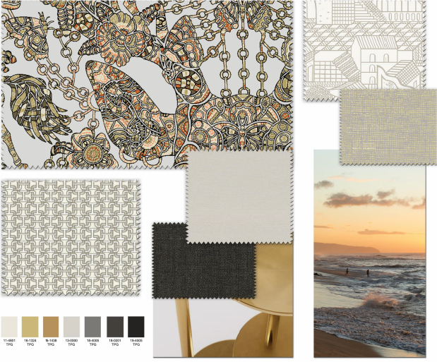 From Evolution I we highlight tosca blue and grayish taupe color in the moodboard, where they elicit a cinematic setting that truly draws attention.