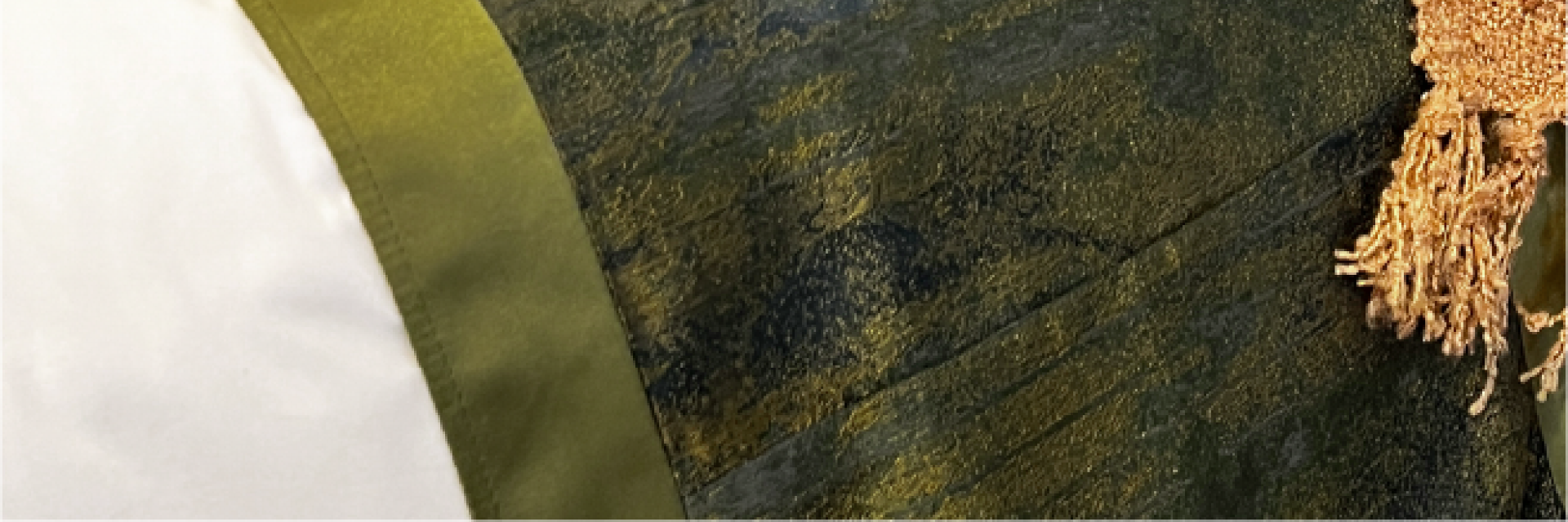 Picture a beautiful set of bed runner and throw pillows in captivating shades of olive hue. Picture the essence of a peaceful forest retreat, as this carefully chosen color palette effortlessly captures the serene beauty of nature's embrace.